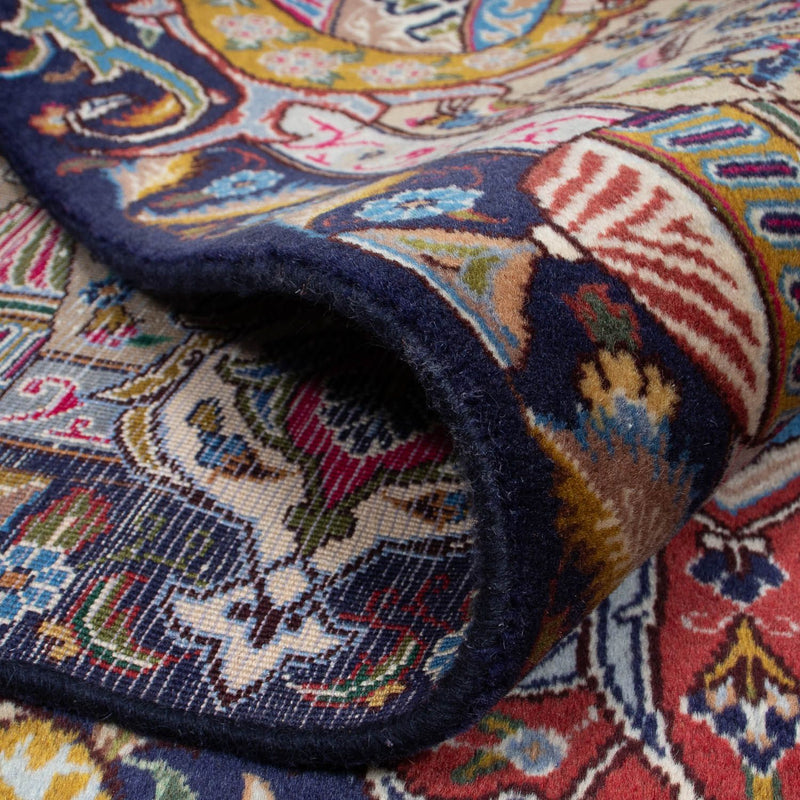 Dieser handgeknüpfte Kaschmar ist ein Beweis echten Könnens. Von Hand geknüpft, mit dem Auge für selbst kleinste Details. Typisch für Kaschmar-Teppiche sind ihre einzigartigen Muster aus Gemälden Bäumen, Blumen, Menschen und Tiere. Zudem sind Darstellungen abgebildet, die historische Ereignisse darstellen, wie z.B. ein wichtiges Ereignis aus der Geschichte Persiens oder einer bekannten historischen Person, oder die Geschichte eines ehrenhaften persischen Königs. Er ist meist nur in Großgrößen erhältlich und erinnert in bestimmten Fällen an klassische Keshan Teppiche mit ihren Medaillons und besonderen Eckmustern.