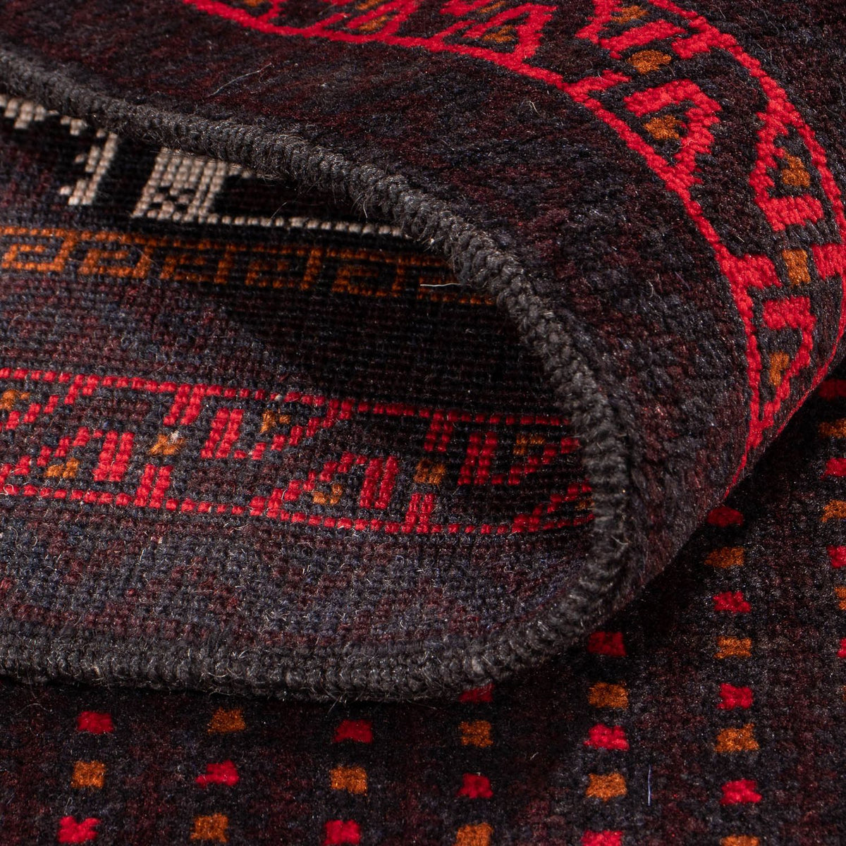 Dieser Belutsch-Teppich ist ein wundervolles Beispiel echter Nomadenkunst. Der Belutsch wird in 3 Ländern geknüpft: im Iran, in Afghanistan und in Pakistan. Seinen Namen hat er vom Stamme der Baluchen, wird aber auch von anderen Stämmen geknüpft. Vorwiegend werden kleine Teppiche bzw. Brücken geknüpft. Große Teppiche sind selten. Sie weisen ein sehr gutes Preis-Leistungsverhältnis auf, sind sorgfältig gearbeitet und werden in vielen verschiedenen, oft geometrischen, Mustern hergestellt. Die Teppiche sind strapazierfähig und sind unter allen modernen Nomadenteppichen als sehr bekannt.