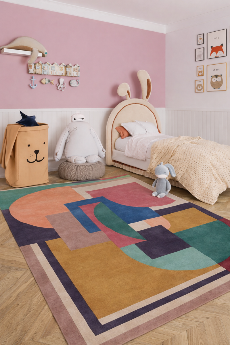 Das Design von EtherealMotifs lebt von einer vielschichtigen Anordnung geometrischer Formen, die sich wie überlagernde Ebenen zu einem fließenden Gesamtbild verbinden. Rundungen, Flächen und klare Konturen greifen ineinander und erzeugen eine visuelle Tiefe, die den Teppich zu einem architektonischen Statement innerhalb moderner Wohnräume macht. Die Komposition wirkt lebendig, aber gleichzeitig ausgewogen – ideal für Interieurs, die Wert auf künstlerische Struktur und klare Linien legen.