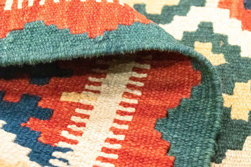 Dieser kunstvolle Kelim - Oriental besticht das Auge mit seinen angesagten Farben. So bringt er eine moderne und harmonische Eleganz in Ihr Wohnambiente mit ein. Kelim Teppiche sind im Gegensatz zu klassischen Orientteppichen in traditioneller Art handgewebt statt geknüpft. In anderen Ländern werden diese Exemplare auch als Kissen oder Vorhänge genutzt. Diese Teppiche haben einen dünnen Flor, für das feste Obergewebe wird 100% Schurwolle verwendet, welche von Natur aus äußerst pflegeleicht und strapazierbar ist. Als echten Kelim bezeichnen Experten nur Teppiche, welche in der Türkei, dem Kaukasusgebiet, Persien, Afghanistan und Turkmenien hergestellt wurden. Echte Teppiche aus dem Orient eben.