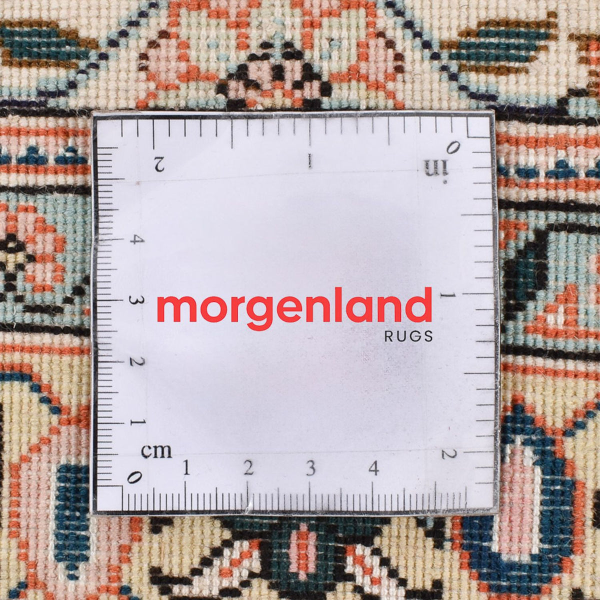 Dieser fein geknüpfte Perserteppich - Täbriz – Royal ist mit hochwertiger Korkwolle, in sorgfältiger und fehlerfreier Handarbeit gefertigt. Der Täbriz 40 Raj gehört zu den schönsten seiner Klasse. Diese Teppiche begründeten den guten Ruf der persischen Knüpfkunst. Er ist ein sehr beliebter Teppich aus einem der besten Knüpfgebiete Persiens. Sie haben oft ein großes, zentral platziertes Medaillon aus schönen Blumenmotiven, ein typisch orientalisches Motiv. Täbriz-Teppiche haben häufig die zusätzliche Bezeichnung Raj. Man unterscheidet zwischen 40, 50, 60, 70, 80 Raj. Je höher die angegebene Zahl ist, desto feiner und dichter ist der Teppich geknüpft. Raj ist eine Qualitätsbezeichnung und bezieht sich auf die Anzahl der Knoten auf einer Breite von ca. 70 mm. Aufgrund der dichten Knüpfung ist der Teppich strapazierfähig, unempfindlich und auch für extreme Benutzung gut geeignet. Klassische Eleganz und Farb-Opulenz zeichnen diesen edlen Teppich aus.