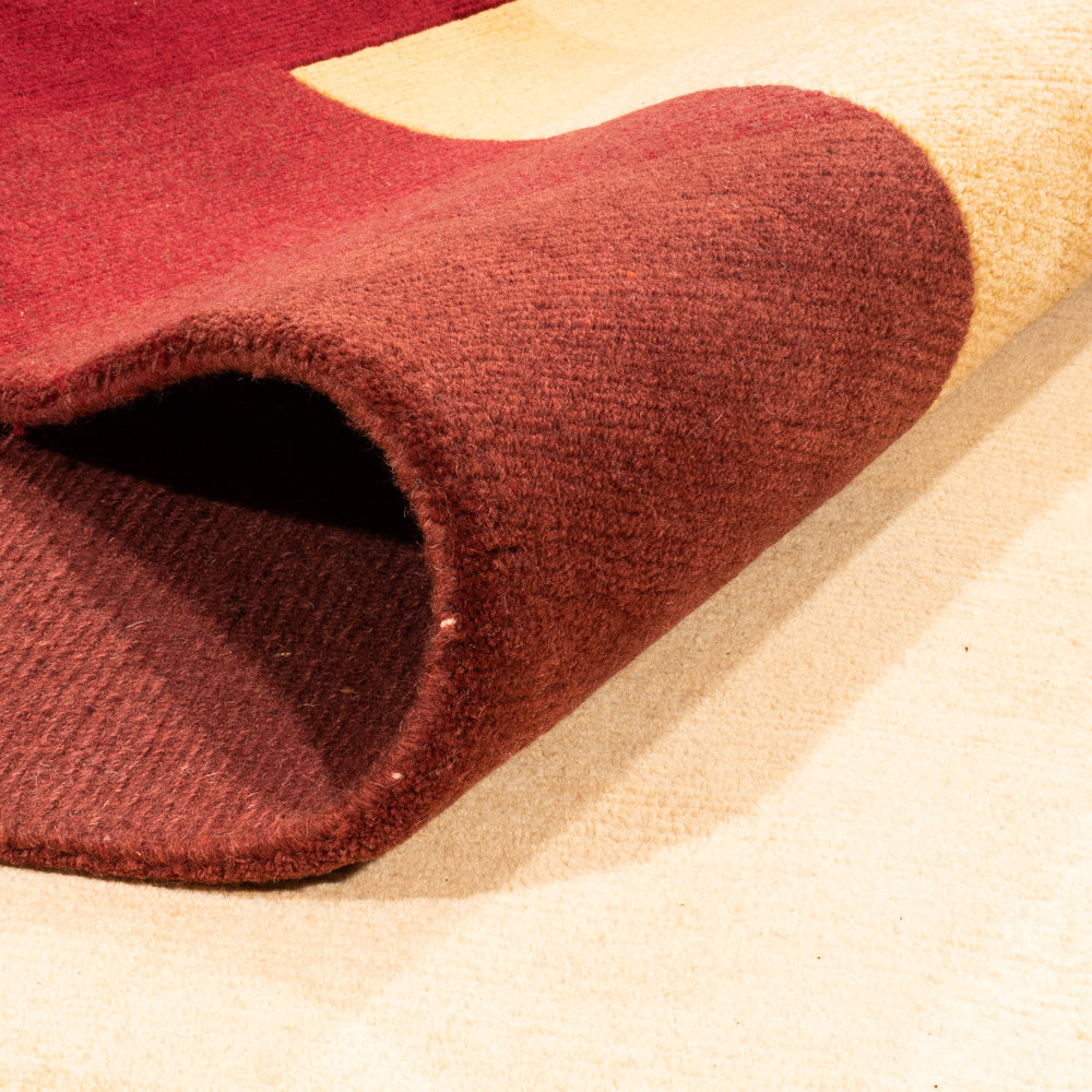 Die handgesponnene Wolle verleiht dem Teppich eine einzigartige, leicht strukturierte Oberfläche mit dezentem Glanz – ein Zeichen echter Handwerkskunst. Gleichzeitig wirkt das Material temperaturausgleichend, schmutzabweisend und sorgt für ein behagliches Raumklima.