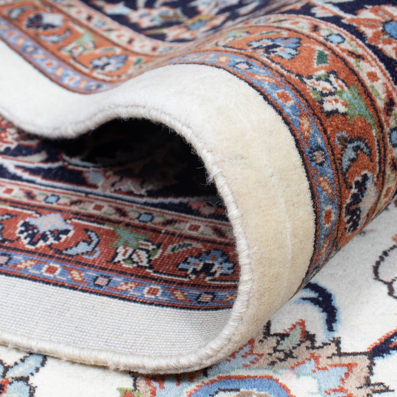Die handgesponnene Wolle verleiht dem Teppich eine einzigartige, leicht strukturierte Oberfläche mit dezentem Glanz – ein Zeichen echter Handwerkskunst. Gleichzeitig wirkt das Material temperaturausgleichend, schmutzabweisend und sorgt für ein behagliches Raumklima.