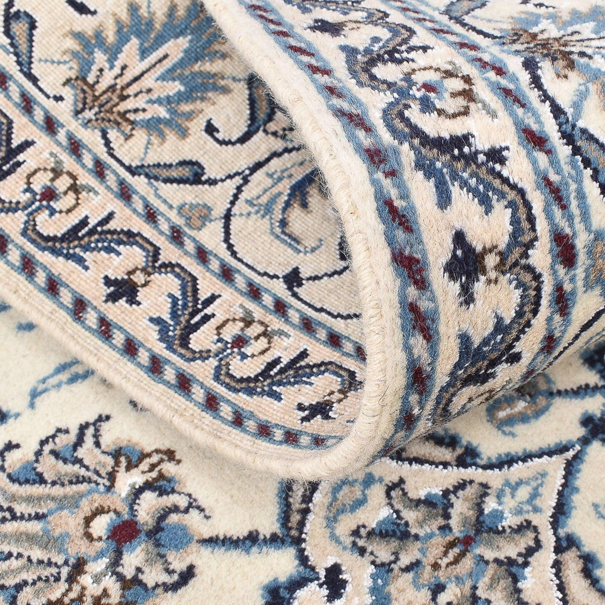 Nain Teppiche werden in hervorragender Feinheit geknüpft. Als Flormaterial wird meist beste, samtartige Korkwolle und immer Seide verwendet, damit eine exakte Musterung von Medaillons und All-Over-Musterung ausgeführt werden kann. Man unterscheidet den Nain in 4 Qualitätsstufen, die in „La“ angegeben werden. 4La, 6La, 9La, 12La. Dies ist eine Qualitätsbezeichnung und bezieht sich auf die Anzahl der Faden Schichten, die in jedem Kettfäden enthalten sind. Je geringerer die angegebene Zahl ist, desto höher die Knotendichte, desto feiner und dichter ist der Teppich. Nains gehören zu den Schönsten auf der Welt. Sie sind auch bei Sammlern sehr beliebt. Durch ihre schlichte Eleganz passen Nains auch in moderne Einrichtungen und bringen Luxus ins Haus.