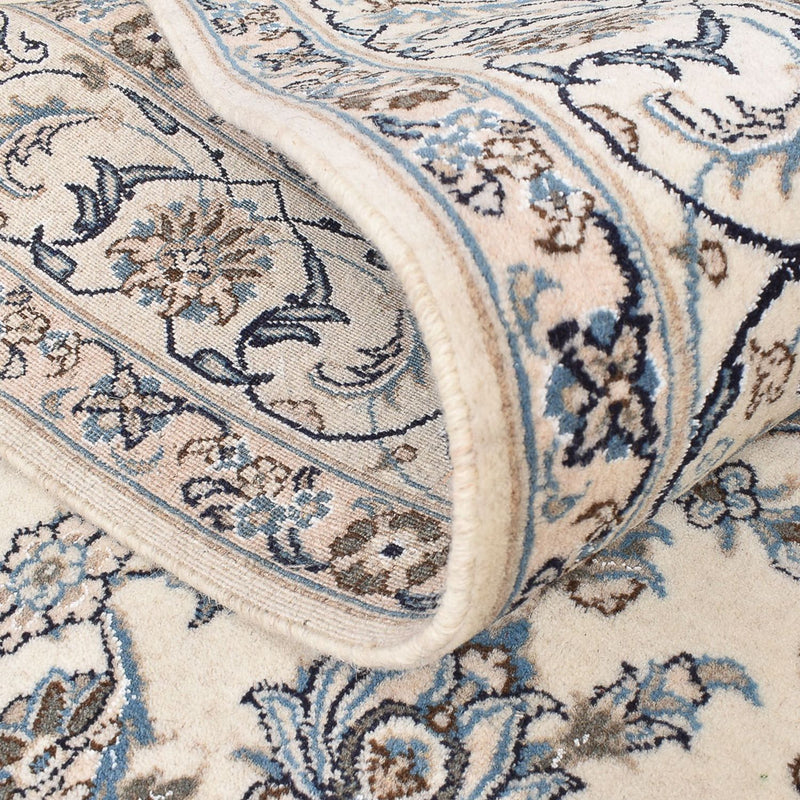 Nain Teppiche werden in hervorragender Feinheit geknüpft. Als Flormaterial wird meist beste, samtartige Korkwolle und immer Seide verwendet, damit eine exakte Musterung von Medaillons und All-Over-Musterung ausgeführt werden kann. Man unterscheidet den Nain in 4 Qualitätsstufen, die in „La“ angegeben werden. 4La, 6La, 9La, 12La. Dies ist eine Qualitätsbezeichnung und bezieht sich auf die Anzahl der Faden Schichten, die in jedem Kettfäden enthalten sind. Je geringerer die angegebene Zahl ist, desto höher die Knotendichte, desto feiner und dichter ist der Teppich. Nains gehören zu den Schönsten auf der Welt. Sie sind auch bei Sammlern sehr beliebt. Durch ihre schlichte Eleganz passen Nains auch in moderne Einrichtungen und bringen Luxus ins Haus.