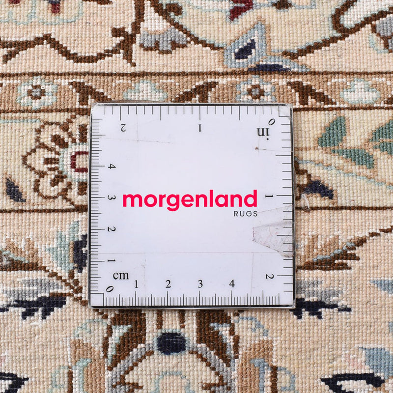 Dieser schöne und selten fein geknüpfte Perserteppich – Nain – Premium gehört zur höchsten Qualitätsstufe 4 mit circa 890.000 bis 1.000.000 Knoten pro Quadratmeter. Dem feinen Nain 6La, ist der Ruhm der Provenienz zu verdanken. Er gilt im gesamten Orient als besonders hochwertiger persischer Teppich. Nain Teppiche werden in hervorragender Feinheit geknüpft. Als Flormaterial wird meist beste, samtartige Korkwolle und immer Seide verwendet, damit eine exakte Musterung von Medaillons und All Over-Musterung ausgeführt werden kann. Man unterscheidet den Nain in 4 Qualitätsstufen, die in „La“ angegeben werden. 4La, 6La, 9La, 12La. Dies ist eine Qualitätsbezeichnung und bezieht sich auf die Anzahl der Fadenschichten, die in jedem Kettenfaden enthalten sind. Je geringerer die angegebene Zahl ist, desto feiner und dichter ist der Teppich. Nains gehören zu den Schönsten auf der Welt. Sie sind bei Sammlern sehr beliebt. Durch ihre schlichte Eleganz passen Nains auch in moderne Einrichtungen.