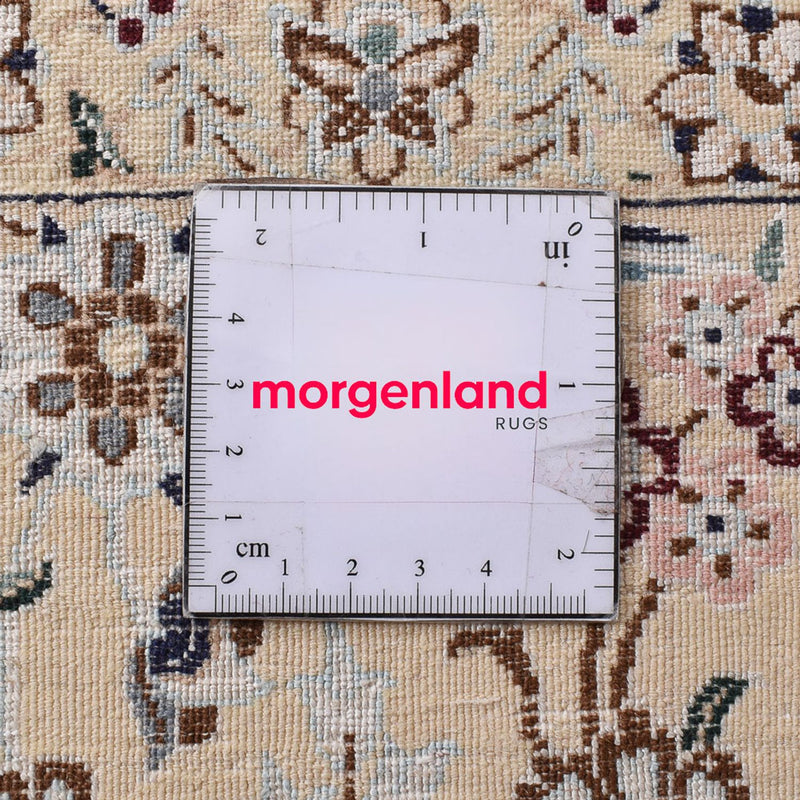 Dieser schöne und selten fein geknüpfte Perserteppich – Nain – Premium gehört zur höchsten Qualitätsstufe 4 mit circa 890.000 bis 1.000.000 Knoten pro Quadratmeter. Dem feinen Nain 6La, ist der Ruhm der Provenienz zu verdanken. Er gilt im gesamten Orient als besonders hochwertiger persischer Teppich. Nain Teppiche werden in hervorragender Feinheit geknüpft. Als Flormaterial wird meist beste, samtartige Korkwolle und immer Seide verwendet, damit eine exakte Musterung von Medaillons und All Over-Musterung ausgeführt werden kann. Man unterscheidet den Nain in 4 Qualitätsstufen, die in „La“ angegeben werden. 4La, 6La, 9La, 12La. Dies ist eine Qualitätsbezeichnung und bezieht sich auf die Anzahl der Fadenschichten, die in jedem Kettenfaden enthalten sind. Je geringerer die angegebene Zahl ist, desto feiner und dichter ist der Teppich. Nains gehören zu den Schönsten auf der Welt. Sie sind bei Sammlern sehr beliebt. Durch ihre schlichte Eleganz passen Nains auch in moderne Einrichtungen.