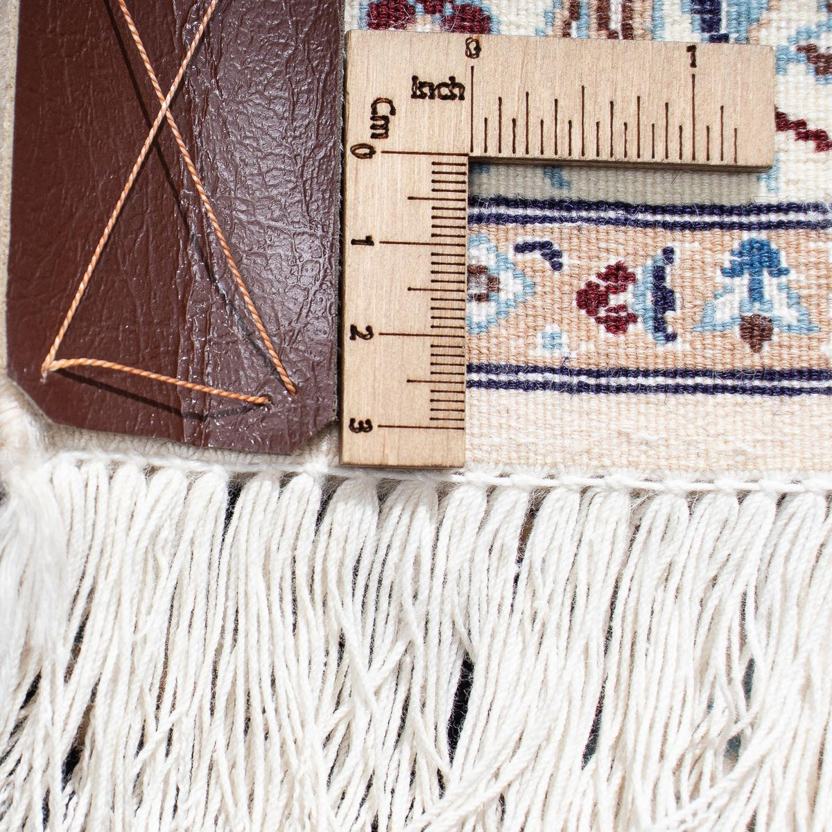 Dieser schöne und selten fein geknüpfte Perserteppich – Nain – Premium gehört zur höchsten Qualitätsstufe 4 mit circa 890.000 bis 1.000.000 Knoten pro Quadratmeter. Dem feinen Nain 6La, ist der Ruhm der Provenienz zu verdanken. Er gilt im gesamten Orient als besonders hochwertiger persischer Teppich. Nain Teppiche werden in hervorragender Feinheit geknüpft. Als Flormaterial wird meist beste, samtartige Korkwolle und immer Seide verwendet, damit eine exakte Musterung von Medaillons und All Over-Musterung ausgeführt werden kann. Man unterscheidet den Nain in 4 Qualitätsstufen, die in „La“ angegeben werden. 4La, 6La, 9La, 12La. Dies ist eine Qualitätsbezeichnung und bezieht sich auf die Anzahl der Fadenschichten, die in jedem Kettenfaden enthalten sind. Je geringerer die angegebene Zahl ist, desto feiner und dichter ist der Teppich. Nains gehören zu den Schönsten auf der Welt. Sie sind bei Sammlern sehr beliebt. Durch ihre schlichte Eleganz passen Nains auch in moderne Einrichtungen.