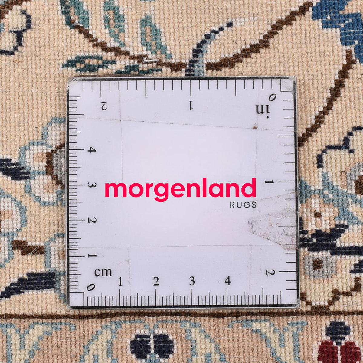 Dieser schöne und selten fein geknüpfte Perserteppich – Nain – Premium gehört zur höchsten Qualitätsstufe 4 mit circa 890.000 bis 1.000.000 Knoten pro Quadratmeter. Dem feinen Nain 6La, ist der Ruhm der Provenienz zu verdanken. Er gilt im gesamten Orient als besonders hochwertiger persischer Teppich. Nain Teppiche werden in hervorragender Feinheit geknüpft. Als Flormaterial wird meist beste, samtartige Korkwolle und immer Seide verwendet, damit eine exakte Musterung von Medaillons und All Over-Musterung ausgeführt werden kann. Man unterscheidet den Nain in 4 Qualitätsstufen, die in „La“ angegeben werden. 4La, 6La, 9La, 12La. Dies ist eine Qualitätsbezeichnung und bezieht sich auf die Anzahl der Fadenschichten, die in jedem Kettenfaden enthalten sind. Je geringerer die angegebene Zahl ist, desto feiner und dichter ist der Teppich. Nains gehören zu den Schönsten auf der Welt. Sie sind bei Sammlern sehr beliebt. Durch ihre schlichte Eleganz passen Nains auch in moderne Einrichtungen.