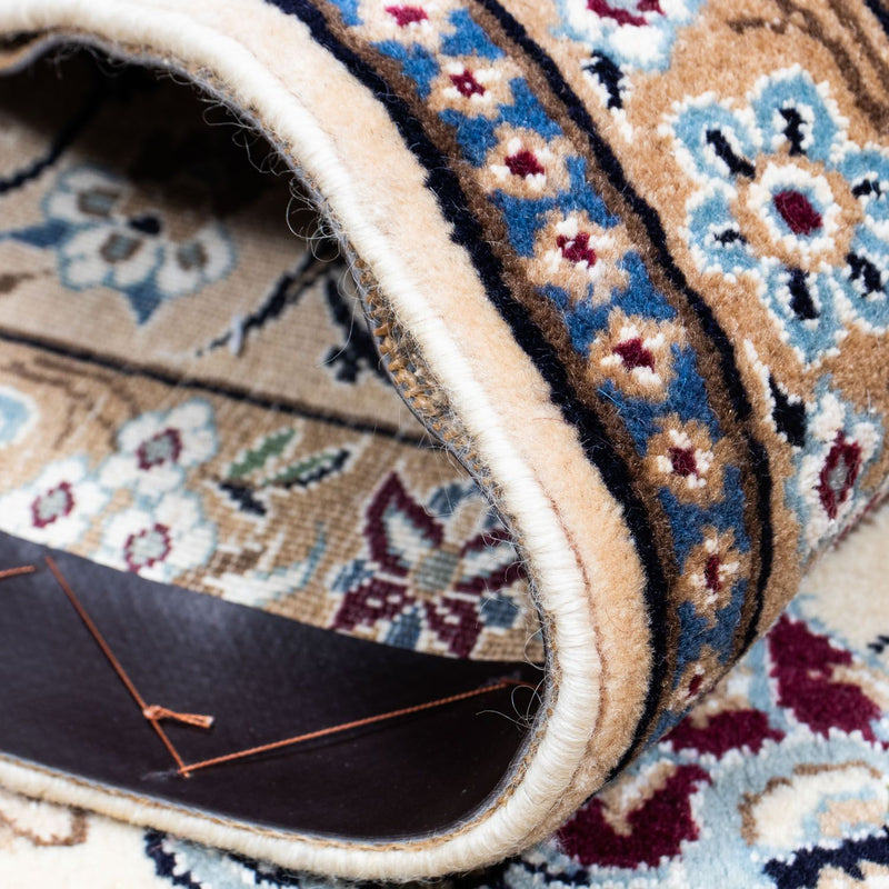Dieser fein von Hand geknüpfte Nain 9La passt sich perfekt in Ihrem Zuhause an. Er besteht aus Korkwolle und feinster Seide, wodurch er sich besonders weich unter den Füßen anfühlt und durch seinen Glanz eine luxuriöse Atmosphäre schafft. Der Perserteppich – Nain – Royal gehört zu der hohen Qualitätsstufe 3 mit circa 250.000 bis 360.000 Knoten pro Quadratmeter. Das heißt, dass er sehr dicht ist und so eine Langlebigkeit garantiert. Egal, welchen Einrichtungsstil sie bei sich im Haus bevorzugen – mit einem Nain Teppich treffen Sie immer die richtige Wahl.