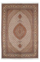 Der Täbriz gehört zu den schönsten seiner Klasse. Diese Teppiche begründeten den guten Ruf der persischen Knüpfkunst. Er ist ein sehr beliebter Teppich aus eines der besten Knüpfgebiete Persiens. Sie haben oft ein großes, zentral platziertes Medaillon aus schönen Blumenmotiven, ein typisch orientalisches Motiv. Täbriz-Teppiche haben häufig die zusätzliche Bezeichnung Raj. Man unterscheidet zwischen 40, 50, 60, 70, 80 Raj. Je höher die angegebene Zahl ist, desto feiner und dichter ist der Teppich geknüpft. Raj ist eine Qualitätsbezeichnung und bezieht sich auf die Anzahl der Knoten auf einer Breite von ca. 70 mm. Aufgrund der dichten Knüpfung und dem kurzen Flor ist der Teppich strapazierfähig, unempfindlich und auch für extreme Benutzung gut geeignet.