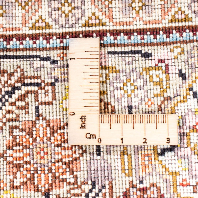 Dieser fein geknüpfte Perserteppich - Täbriz – Royal ist mit hochwertiger Korkwolle, in sorgfältiger und fehlerfreier Handarbeit gefertigt. Der Täbriz 40 Raj gehört zu den schönsten seiner Klasse. Diese Teppiche begründeten den guten Ruf der persischen Knüpfkunst. Er ist ein sehr beliebter Teppich aus einem der besten Knüpfgebiete Persiens. Sie haben oft ein großes, zentral platziertes Medaillon aus schönen Blumenmotiven, ein typisch orientalisches Motiv. Täbriz-Teppiche haben häufig die zusätzliche Bezeichnung Raj. Man unterscheidet zwischen 40, 50, 60, 70, 80 Raj. Je höher die angegebene Zahl ist, desto feiner und dichter ist der Teppich geknüpft. Raj ist eine Qualitätsbezeichnung und bezieht sich auf die Anzahl der Knoten auf einer Breite von ca. 70 mm. Aufgrund der dichten Knüpfung ist der Teppich strapazierfähig, unempfindlich und auch für extreme Benutzung gut geeignet. Klassische Eleganz und Farb-Opulenz zeichnen diesen edlen Teppich aus.